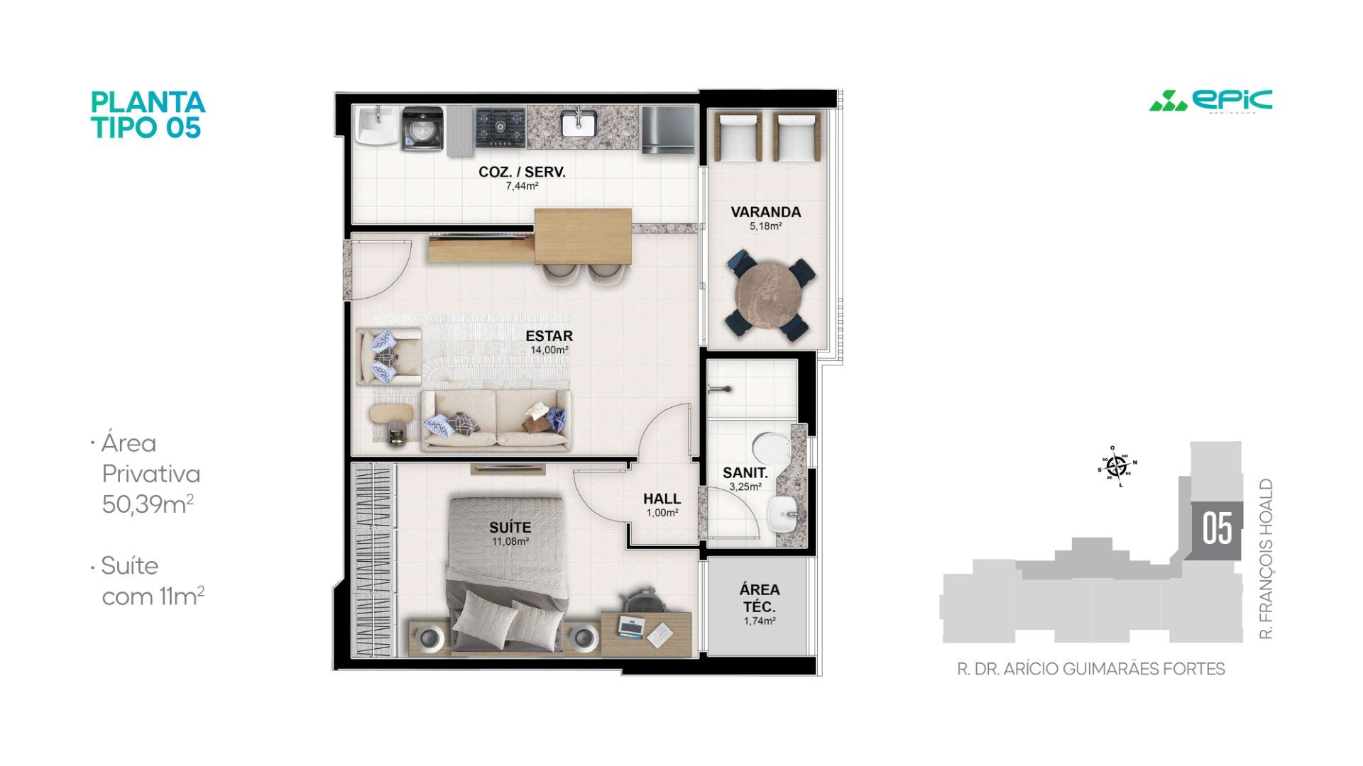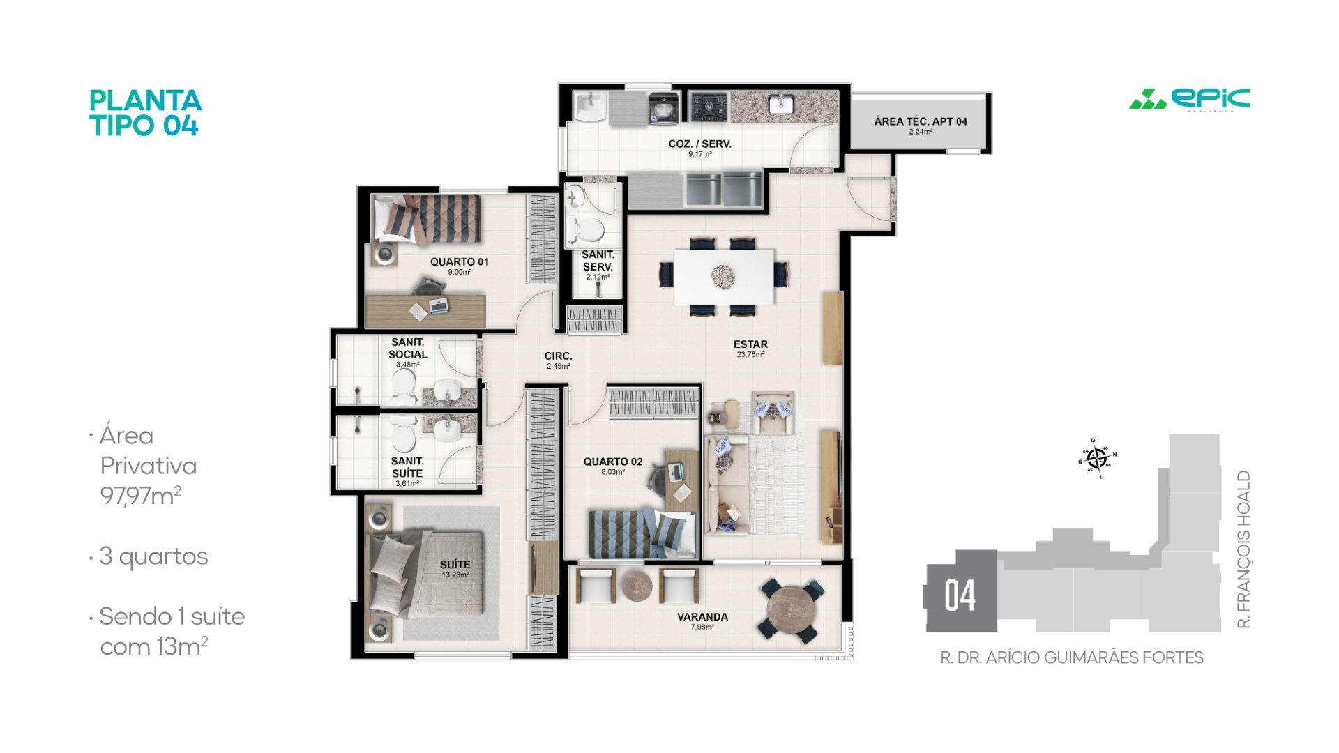 Com apartamentos de 50m² a 97m², o Epic Residence foi pensado para quem valoriza conforto, localização estratégica e estilo de vida urbano — sem abrir mão da sofisticação Santa Maria.